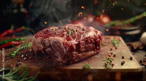 Raw fresh steak of pork or beef in the wooden board