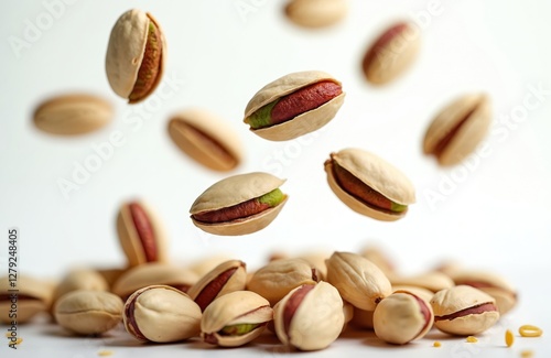 Raw fresh whole and cracked pistachios in set. Flying nuts isolated on white background. Natural salted snack, healthy heap, close-up, macro, green, brown, dried, roasted, organic food concept.
