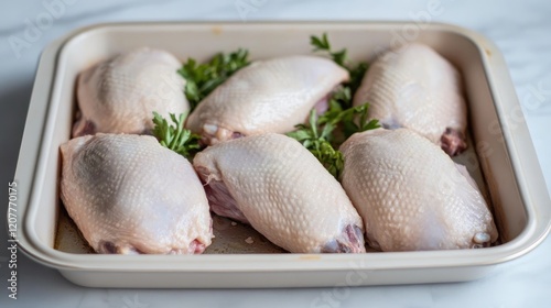 Raw goose meat arranged in a baking tray with fresh herbs ready for cooking in a rustic kitchen setting.