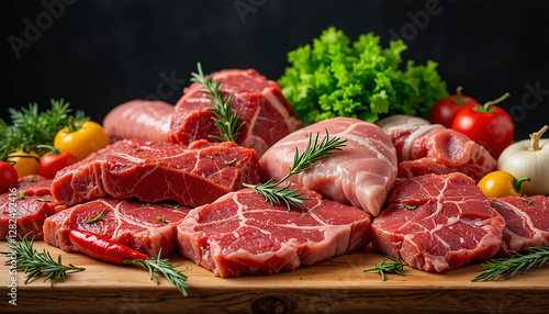Raw Meat Assortment on Wooden Cutting Board with Fresh Vegetables – Gourmet Food Photography