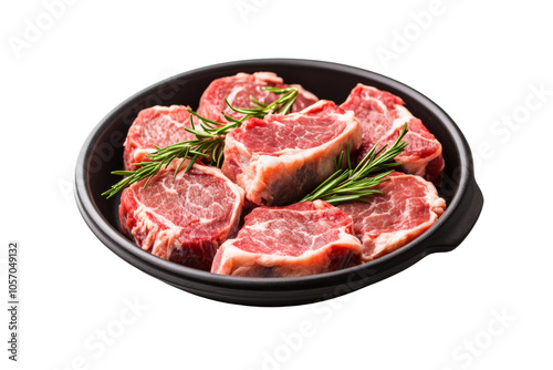 Raw meat cuts arranged in a black plate garnished with fresh rosemary, isolated on a white background.