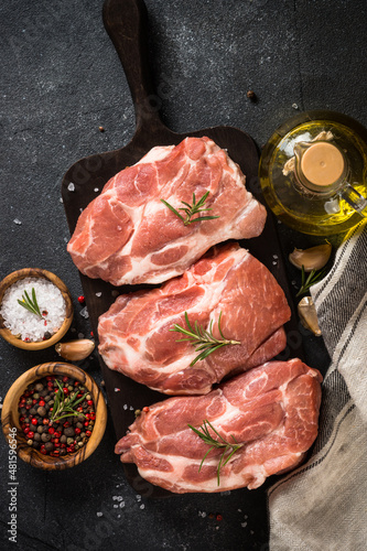 Raw meat. Fresh steaks with herbs and spices at black background. Top view.