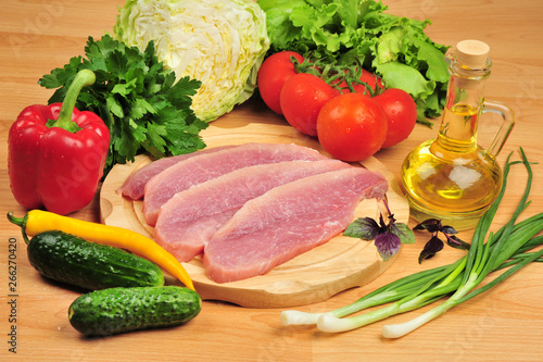 Raw meat on a tray, tomatoes, cucumbers, onions, cabbage, oil for frying, pepper on a wooden background