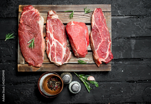 Raw meat. Pork and beef steaks on a tray with spices and rosemary sprig.