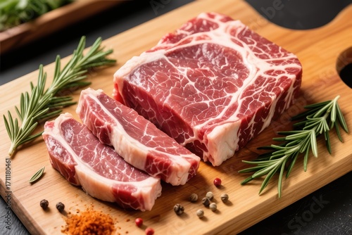 Raw meat. Raw beef steak on a cutting board with rosemary and spices.