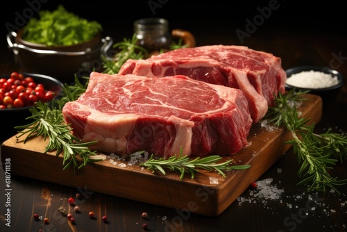 Raw meat, veal ossobuco, on a wooden cutting board. Generative AI