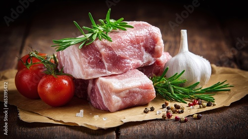 Raw meat with fresh herbs, tomatoes, and garlic on rustic wood surface, ready for cooking.