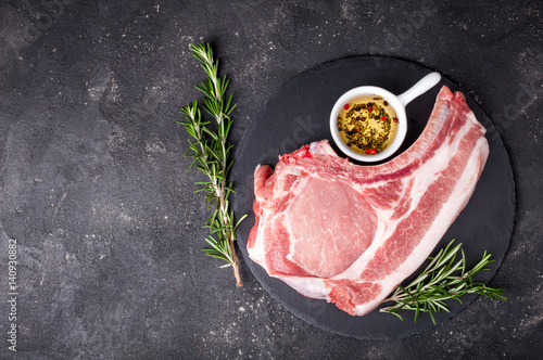Raw meat with herbs, olive oil and spices on dark background with copy space. Raw pork steak. Ingredients for cooking meat. Top view