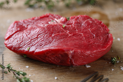 Raw meat with spices and herbs on table