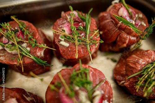 Raw mignon steak with pepper and salt and sprigs of rosemary