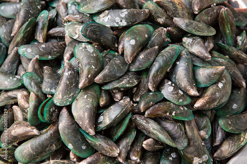 Raw Mussel shell in market,Fresh seafood in Thailand. pile green mussel for sale on the market - Asian green mussel seafood shell in the fish market