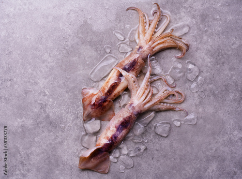 Raw octopus on ice on a black table or board background, fresh octopus for cooked food at a kitchen restaurant or seafood market