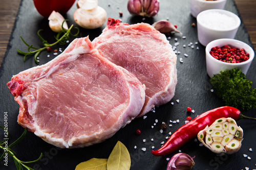 Raw pork chops on cutting board and vegetables