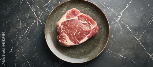 Raw pork on a ceramic plate for preparation. Copy space image. Place for adding text and design