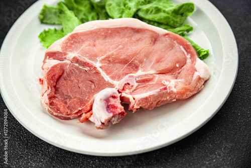 Raw pork on bones meat fresh tasty food dish delicious gourmet food background on the table rustic food top view copy space