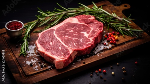 Raw rib eye steak, beef marbled meat on wooden board with rosemary. Generative AI