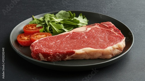 Raw ribeye steak on a black plate with arugula leaves and sliced cherry tomatoes Copy Space