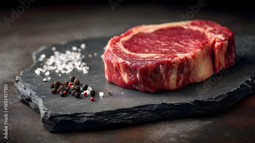 raw ribeye steak on black stone plate with sea salt and peppercorns