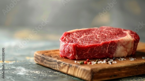 Raw Ribeye Steak on Wooden Board with Seasoning, Artistic Culinary Photography