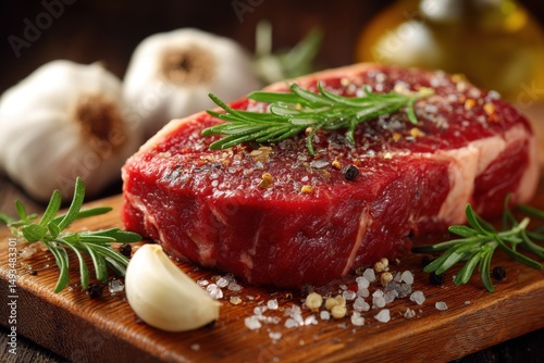 Raw ribeye steak seasoned with rosemary sprigs, peppercorns, and garlic on a rustic wood cutting board for cooking preparation.