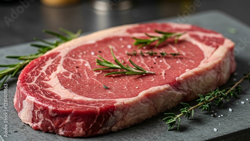 Raw ribeye steak with fresh herbs