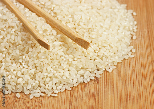 raw rice and chopsticks on bamboo board