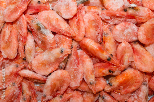 Raw shrimp background. Pile of frozen shrimps on white background.Close-up of frozen shrimps. Shrimp and ice, top view.