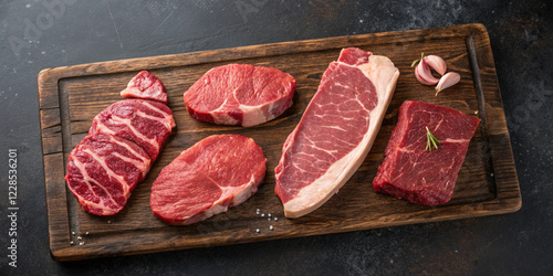 raw steak cuts of varying sizes and textures carefully arranged on a dark wooden surface, showcasing the tenderness and quality of fresh beef selections