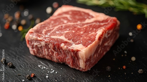 Raw steak on a dark stone board with herbs and spices. Ready to cook