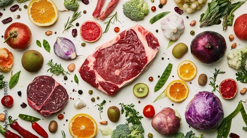 Raw steaks surrounded by fresh fruits, vegetables, and herbs, all arranged artistically on a white background.