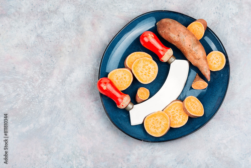 Raw sweet potatoes, yam, space for text.