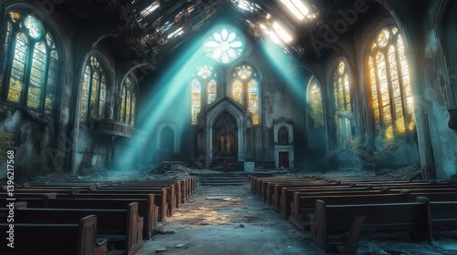Ray of Hope Sunlight Streaming Through Stained Glass in a Serene Abandoned Interior with Wood