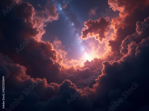 Rayons de lumière perçant des nuages flamboyants dans un ciel dramatique au crépuscule éclatant