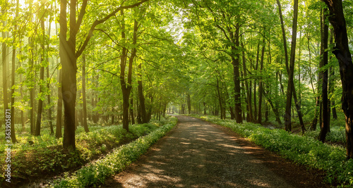 Rays of light fall through a canopy of leaves onto an old road underneath. Bear's garlic blooming alongside a forest road surrounded by trees.