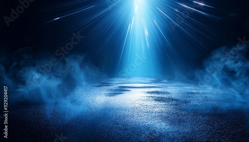 rays searchlight light blue neon dark empty scene with smoke reflections on wet asphalt