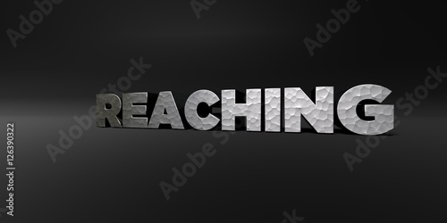 REACHING - hammered metal finish text on black studio - 3D rendered royalty free stock photo. This image can be used for an online website banner ad or a print postcard.