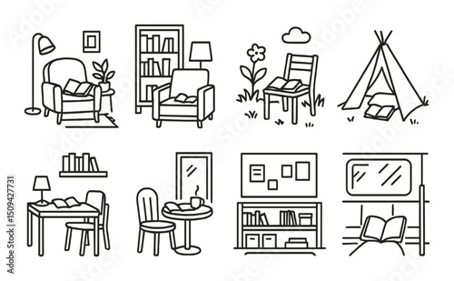 Reading environments outline icons set – linear, book spaces and reading nooks designs