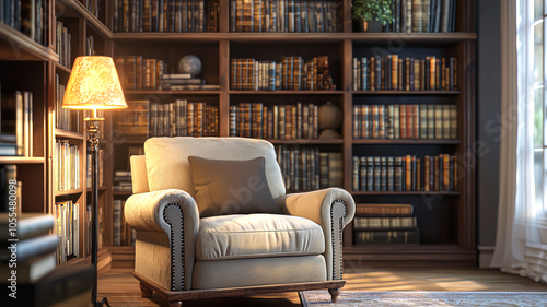 Reading Nook Mockup Frame, Plush Armchair and Bookshelves..