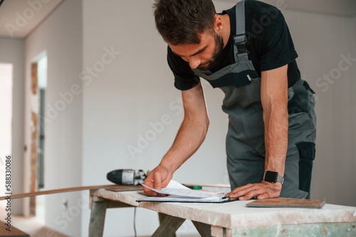 Reading the information. Man is installing new laminated wooden floor