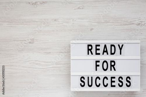 'Ready for success' words on a modern board on a white wooden background, top view. Overhead, from above, flat lay. Space for text.