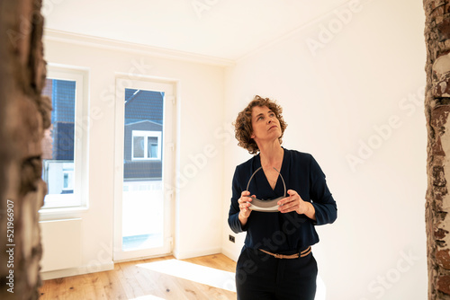Real estate agent holding virtual reality simulator looking up in new home