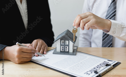 Real estate agent holds the keys to send to the client and offers the conditions for signing the house sale agreement and home insurance to the client, Home sales and home insurance concept.