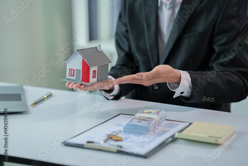 Real estate agent is holding a pen and showing client where to sign a contract for a new house, with a scale model of the property on the tabl