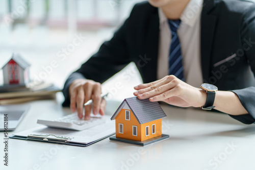 Real estate agent offer house design and contract. Approval of a contract to buy or sell a home. Offers mortgage loans and home insurance concept.