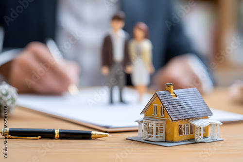 Real estate agent or realtor signing mortgage agreement for new home with couple of happy young clients. Concept of home loan and buying own property. Close up of miniature house