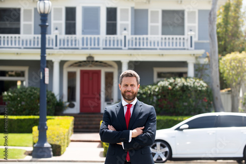 Real estate. Agent ready to sell home. Businessman standing outside a modern house.