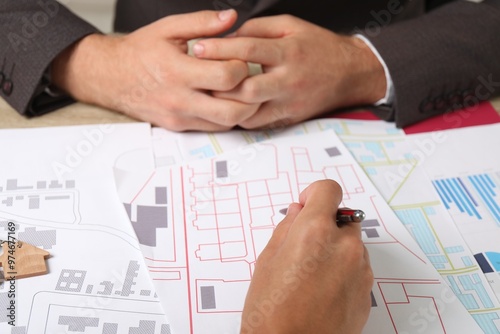 Real estate agent working with client at table, closeup