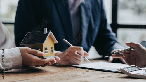 Real estate agents are carrying a housing model of the project to be forwarded to customers as home delivery. Real estate trading ideas and bank loans for buying and selling houses and land.