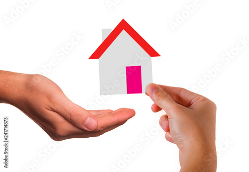 real estate and housing damage cover advertising with woman hand holding house paper cut shape depositing it into protective insurance company hand isolated on white