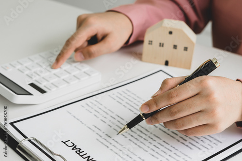 Real estate broker agent presenting and consult to customer to decision making sign insurance form agreement, buy and sell home model, concerning mortgage loan offer for and house insurance